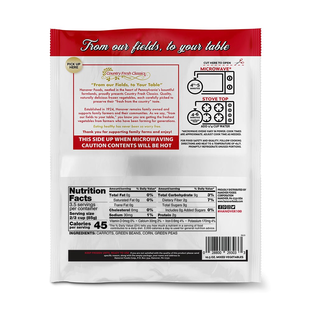 Country Fresh Classics Mixed Vegetables, from Hanover Foods, are a convenient healthy side. They can be heated and served by themselves or used to create a special side dish. Try our complete Country Fresh Classics line of fresh frozen vegetables; the satisfaction of a healthy addition to your table with the fresh country taste that the whole family will enjoy!