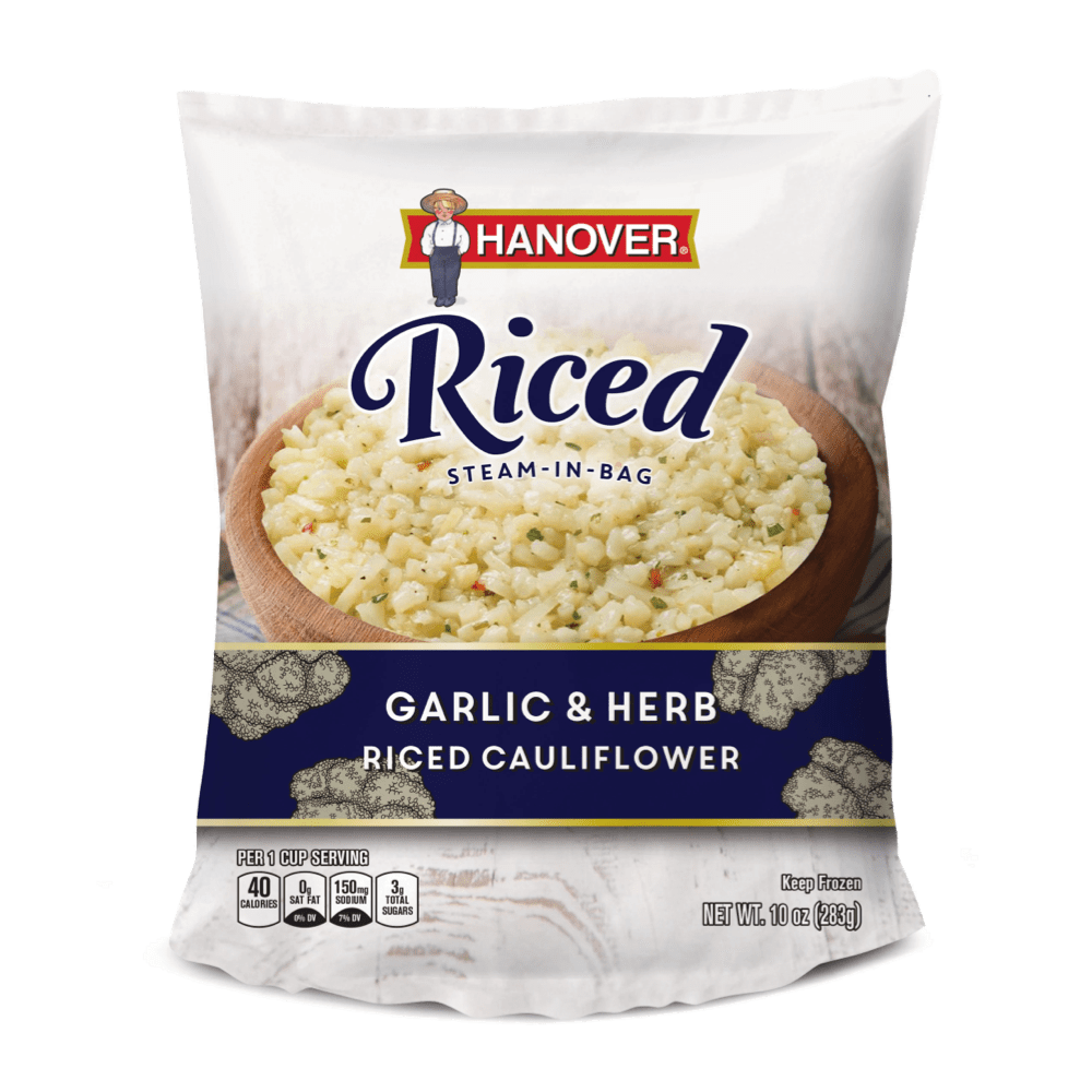 Garlic & Herb Riced Cauliflower, beyond a simple side, this product is an amazing carb friendly ingredient alternative to grain rice and pasta. Commonly used for gluten free pizza crust, mashed sides, sauces and soups, riced cauliflower is cleverly finding its way to the top of the ingredients list!